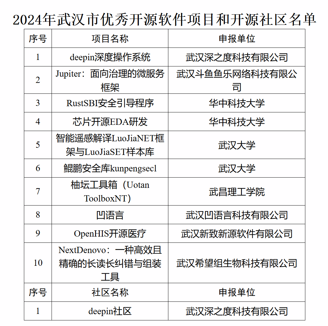 根据《市推进新型工业化领导小组办公室印发关于促进武汉市开源体系建设的实施方案的通知》(武推新工〔2024〕02号)和《市经信局关于印发武汉市优秀开源软件项目和开源社区评价办法(试行)的通知》,武汉市经信局组织开展2024年武汉市优秀开源软件项目和开源社区申报认定工作,经各高校、区经信部门推荐和专家评审,2024年武汉市优秀开源软件项目和开源社区名单如下:
